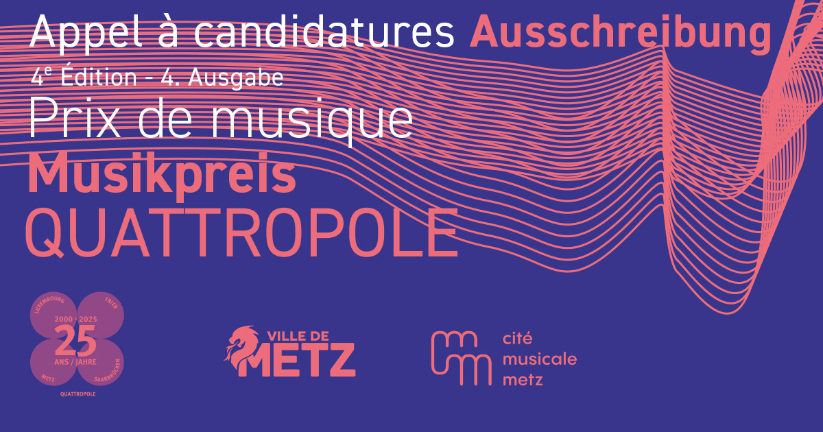 Conception et réalisation des visuels, affiches, flyer et visuels pour réseaux sociaux de l'appel à candidatures du concours de création musicale innovante organisé par Quattropole, qui se tient chaque année sur la Grande Région. Le concept du visuel consiste à jouer avec les lignes d’une portée de partition qui semblent se transformer, onduler… le visuel faisant ainsi référence à la légèreté de la musique, à des représentations d'ondes sonores tout en ayant un aspect technique, moderne et en restant inscrit dans la ligne de communication de l'événement qui se tient depuis quelques années maintenant.